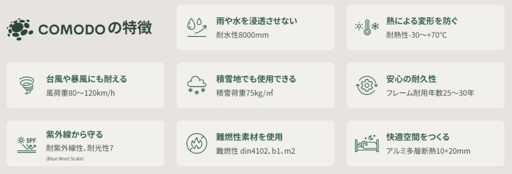セット内容 | フレーム、外幕、ガラスドア、カーテン、断熱ライナー、グランドシート |