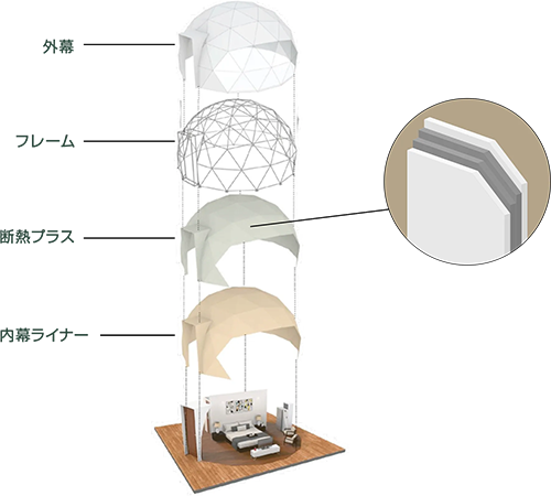 自社で開発した高性能断熱素材「極暖プラス(4層構造)」を採用し、季節を問わず快適な室内環境を実現。冬はしっかりと暖かさを保ち、夏は外気の熱を抑えて涼しく過ごせます。業界でも珍しい4層仕様により断熱性を高め、空調効率の向上と電気代の節約にも貢献します。さらに、内幕シートにはアルミを組み込んだ厚さ10mmの断熱材を使用し、従来のドームテントと比べて優れた断熱性能を発揮します。